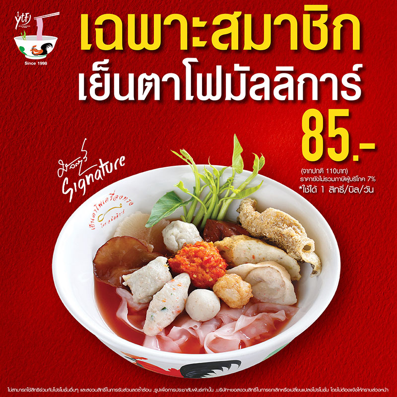 - รับสิทธิ์ทาน เย็นตาโฟ ในราคา 85 บาท จากปกติ 110 บาท ทุกวันทันที ตลอดอายุสมาชิก 2 ปี